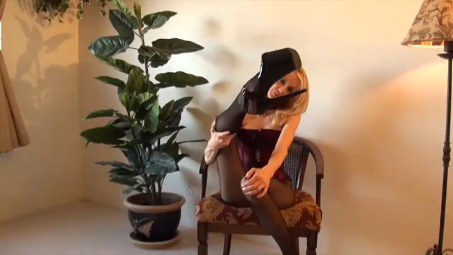 Slim girl Claire in black seamless pantyhose and high stripper heels