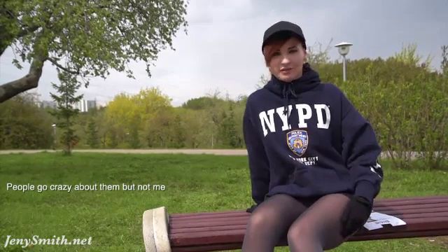 Jeny shows her new Wolford seamless pantyhose in the public place outdoor