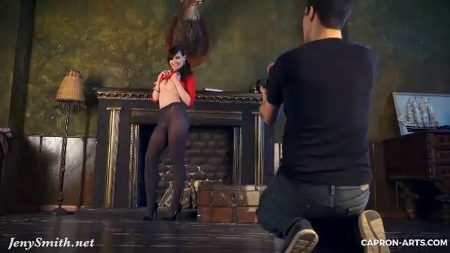 Jeny Smith wearing black opaque seamless pantyhose poses for an erotic photo shoot